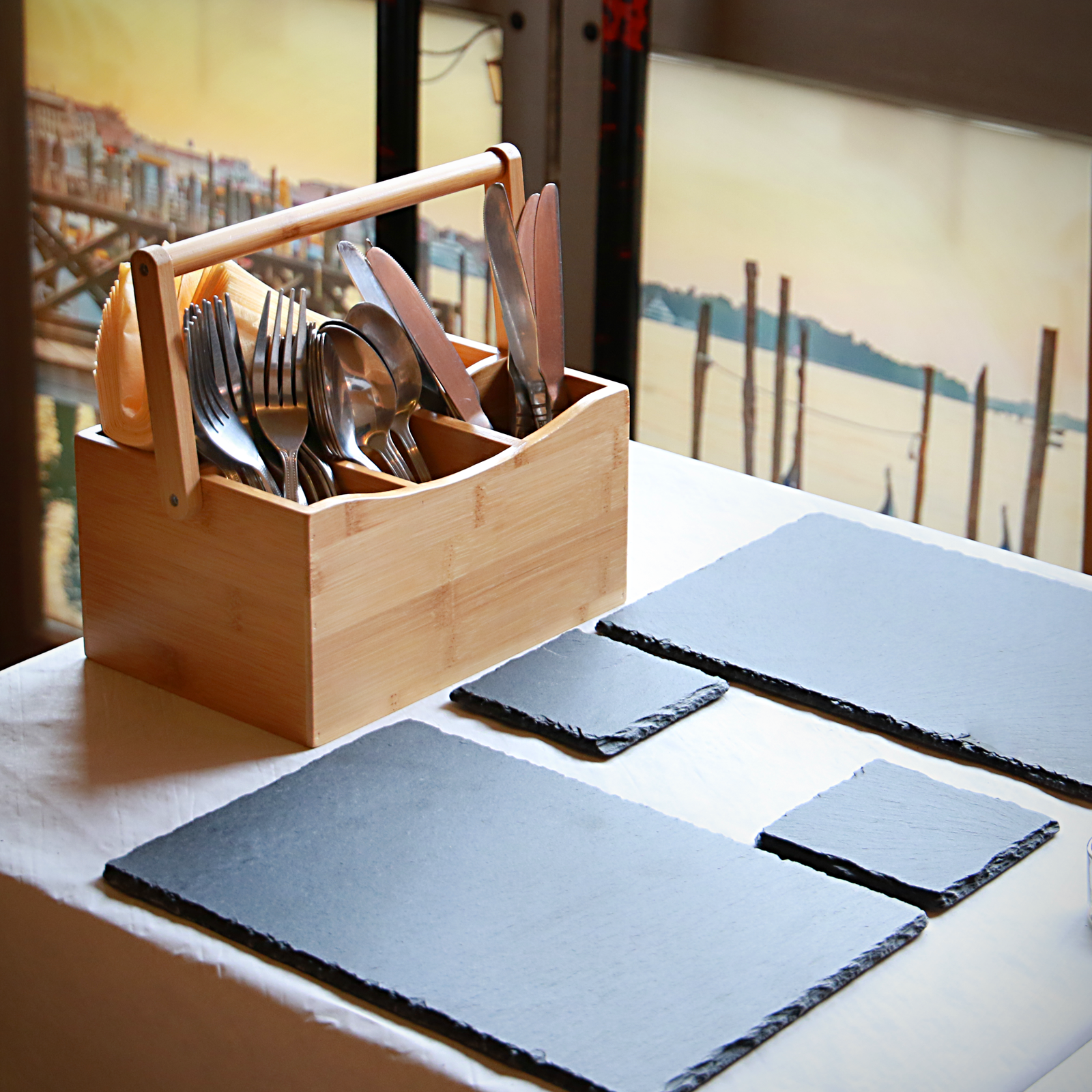 Making back-and-forth trips from the kitchen drawer to the dining area to set the table up with knives and forks ready for a meal can be a nuisance. With the Maison & White Bamboo Utensil Cutlery Holder, this eliminates that hassle as you can transport all of your needed utensils in one trip and thanks to the drop-down handle, it is super easy to carry. Not only does it provide service assistance but it is also a stylish way to organise your cutlery collection. You can place it away in your cupboards for more organisation or place it as a decor piece on your dining table.MADE FROM BAMBOOMade from natural bamboo, this wooden utensil holder is highly durable, water-resistant and sustainable making it perfect for indoor and outdoor use. Thanks to the carry handle and bamboo material, this organiser is lightweight and portable so there is no more than one cutlery-collecting trip needed.FOUR COMPARTMENTSThe rectangular design of this organiser is split into 4 compartments. One side of the holder is divided into 3 for your knives, forks and spoons and the other side, being a larger compartment, is for storing your napkins and even condiments.Specification: